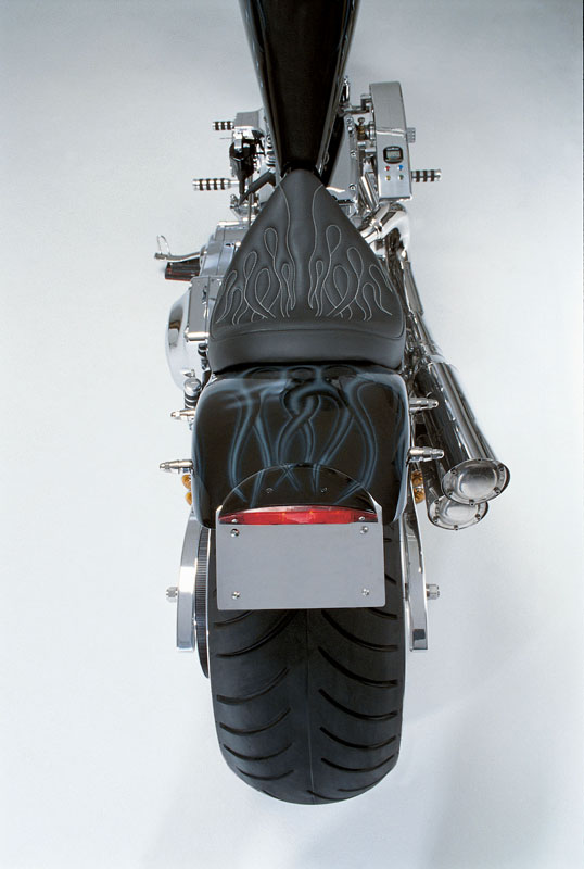 Beim Lack gingen wir konventionelle Wege. Blechteile und Rahmen in klassischem Schwarz mit silbernen Flammen wie es sich für einen Chopper halt gehört.