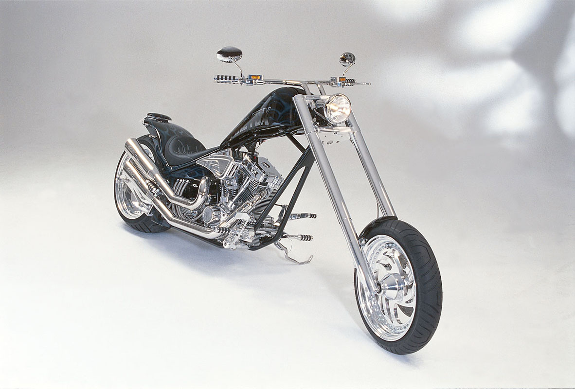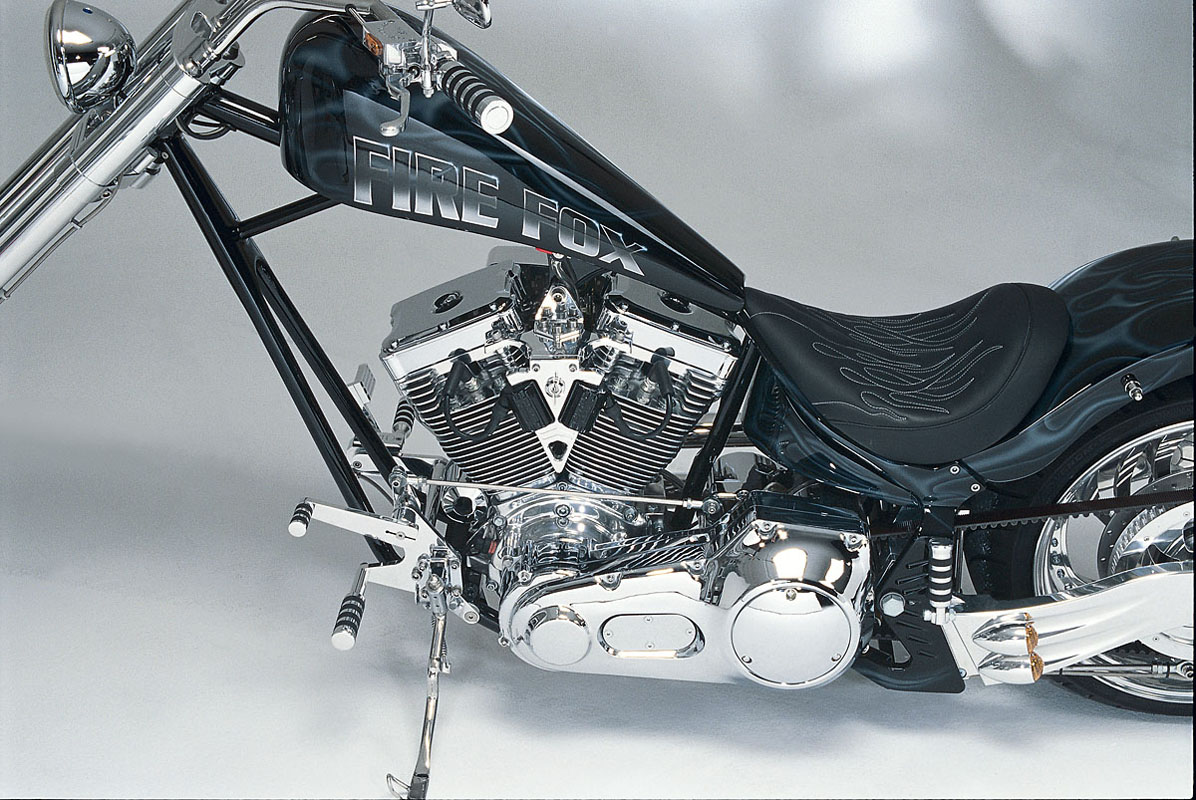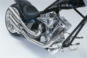Da das Bike eher Cruiser- als Rennqualitäten besitzt reicht zum Vorwärtskommen der 88cui. Motor von S&S allemal aus. Befeuert von einer Dyna® 2000i Zündung verlassen die verbrannten Gase das Triebwerk über einen nicht zu überhörenden Zero Cool Auspuff. Nicht kleckern, sondern klotzen war auch beim Rest des Hobels angesagt. Schwimmende Bremsscheiben mit Vierkolben-Bremssätteln waren Pflicht, denn man will ja auch mal anhalten um den Showeffekt zu genießen. Ein polierter Motor samt ebenso glänzendem Getriebe waren schon fast so selbstverständlich wie VA-Schrauben oder im Rahmen und Lenker verlegte Leitungen und Züge.