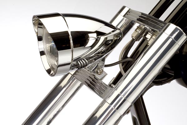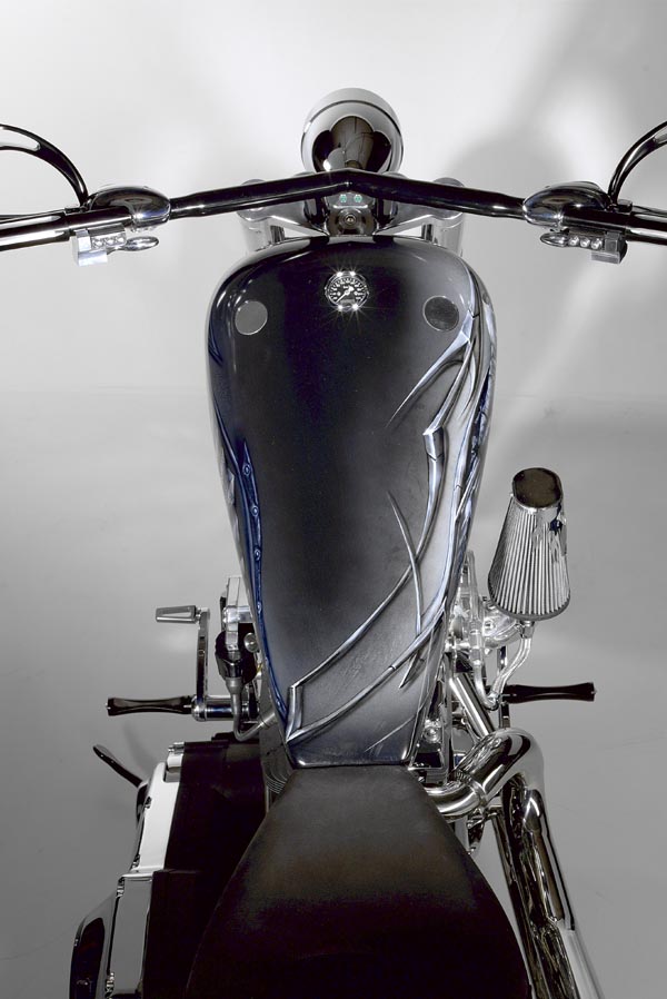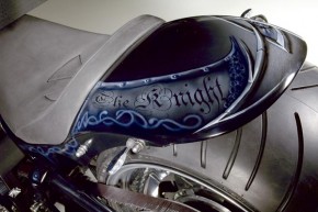 Hierzu ließen wir uns wieder einmal etwas einfallen und stylten ein Bike so dass es wirklich jedem Burgfräulein das Blech vom Keuschheitsgürtel gesprengt hätte. 330er Hinterrad, Rahmen mit 4“ High Neck, einer 10“ Over Gabel und ein Homidor für „die Zigarre danach“ sind nur einzelne Eckpunkte. Um das Ganze sauber zu realisieren mussten sicherlich einige Rüstungen und Schwerter eingeschmolzen werden, doch der Aufwand hat sich gelohnt.