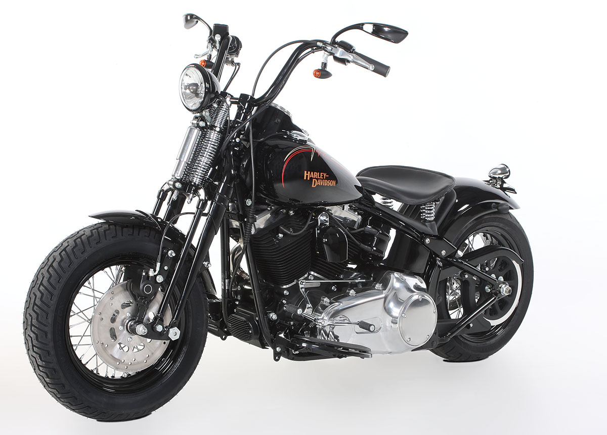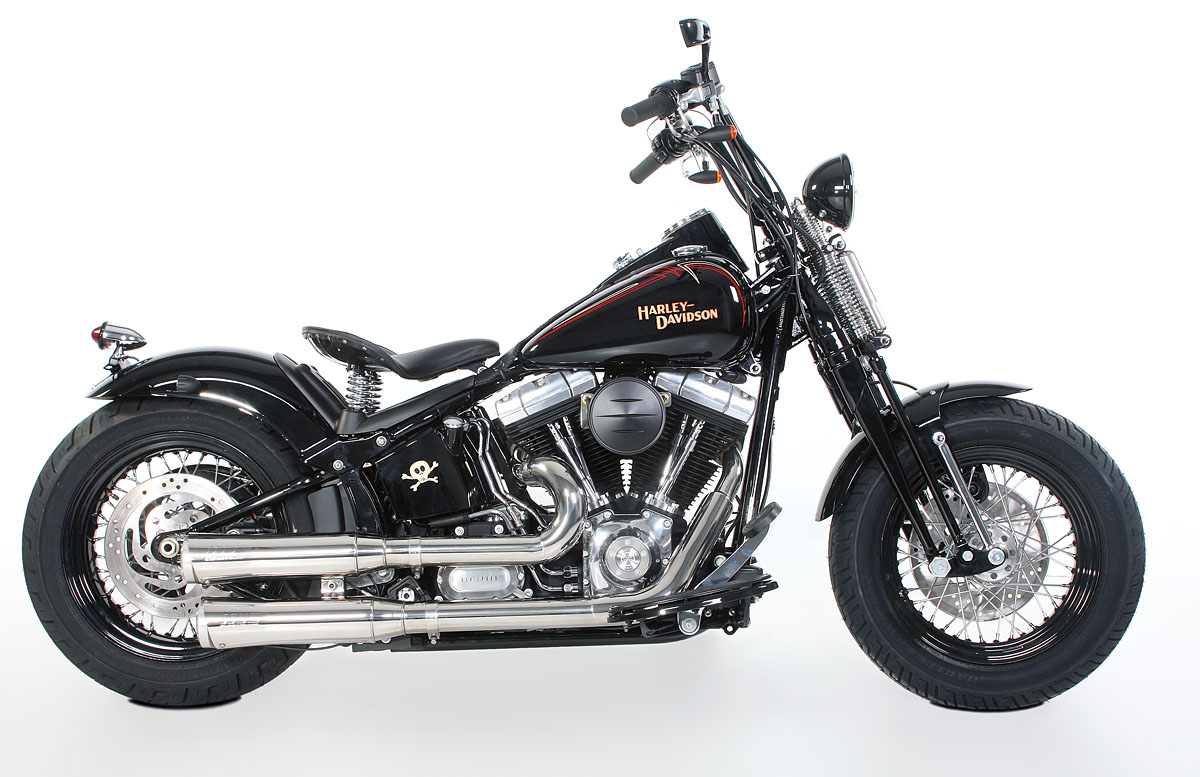 By fitting our Stiletto Special rear fender, Hummer Style tail light and leather sprung saddle minimalism and clear lines are achieved. "A real Rocker rides with an Ape", was once the cry and that goes for today as well so we fitted ape hangers, tailor made to the customer and topped them off with OMP mirrors. Matching Springer risers and lightly modified electrics form part of the customization, as do the braided steel brake lines. The sound of a new Harley is another thing. In the days when Harleys came out of the factory louder than many Rock 'n Roll bands, or the innards of the exhaust silencers were ripped out, every one could hear when a real Rocker was underway. But today they sound pretty soft.